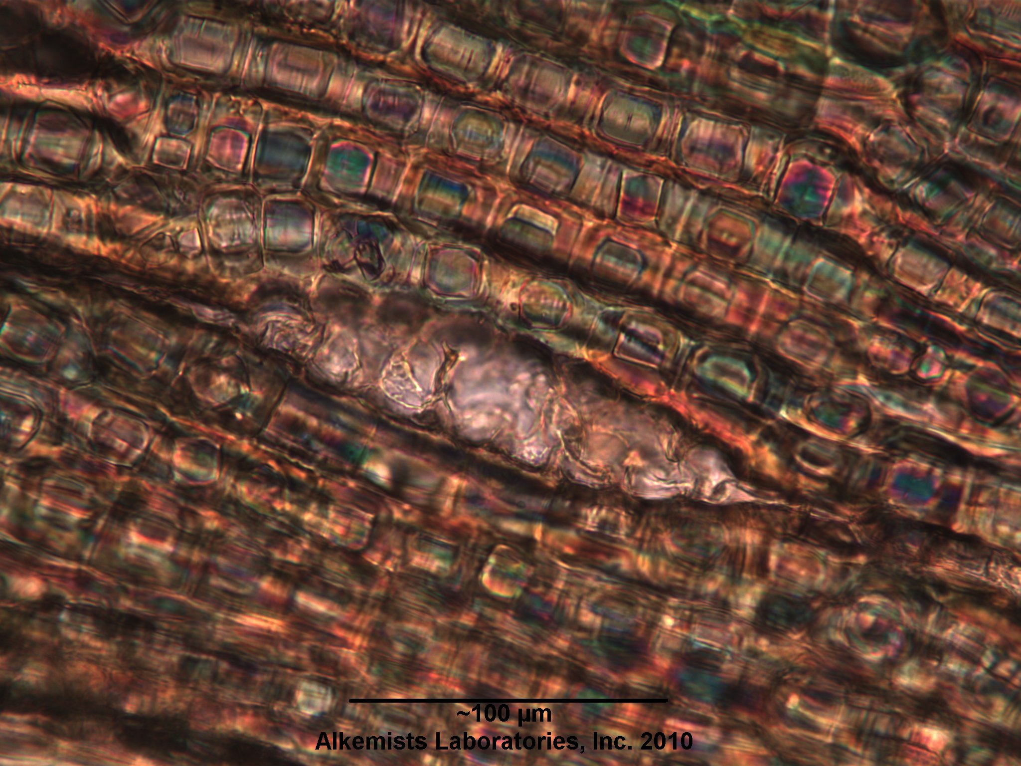 Bark fiber showing calcium oxalate prisms spaced by medullary rays observed at 400x with Acidified Chloral Hydrate Glycerol Solution - Alkemist Laboratories